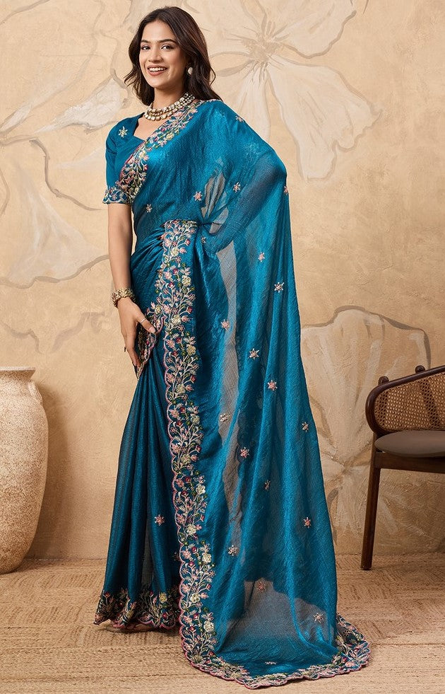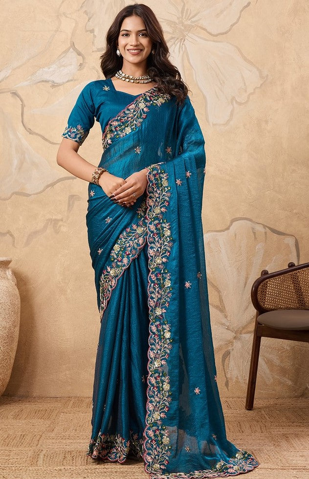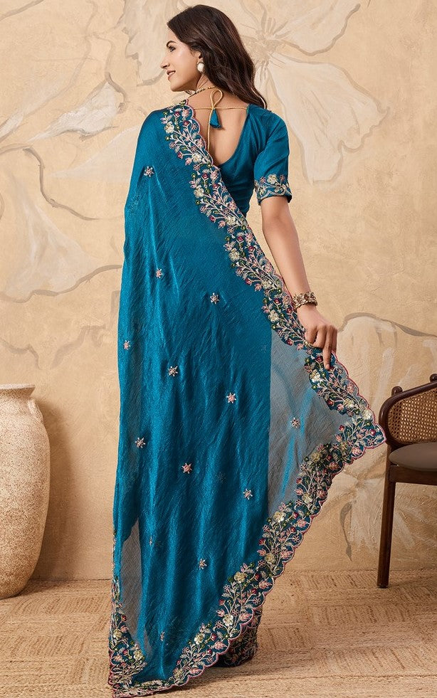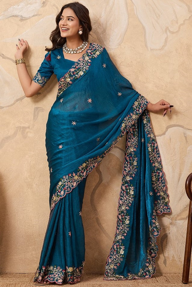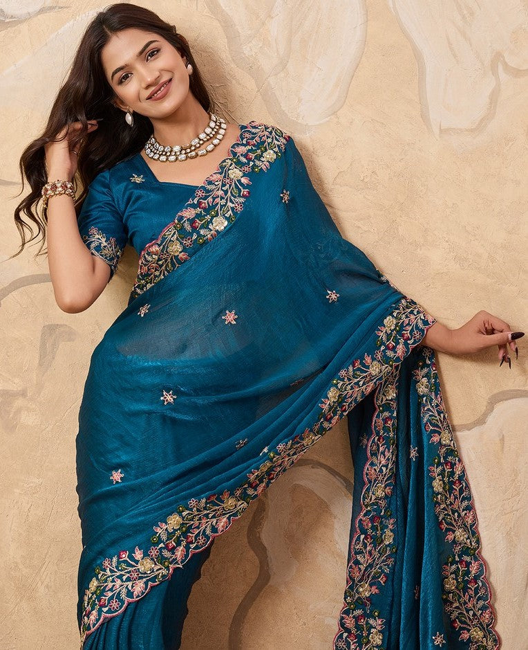 Elegant Teal Color Chiffon Fabric Designer Saree