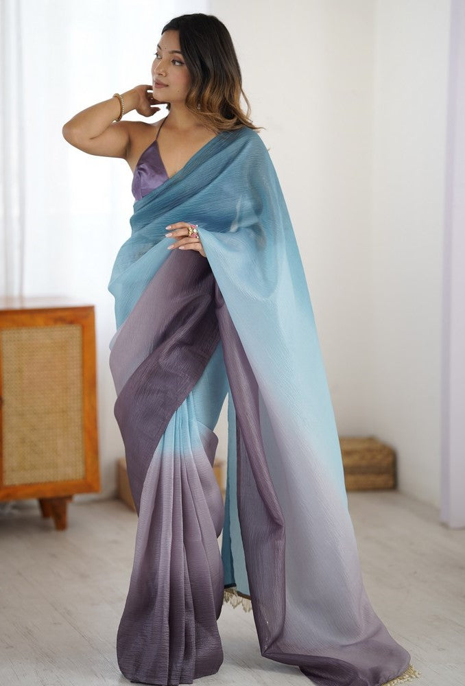 Attractive These Party Wear Ready To Wear Saree in Fine Two Tone Colored. These Saree Are Candy Crush Silk And Blouse is Satin Silk Fabricated. Its Beautified With Pedding Color Solid With Latkan Lace.