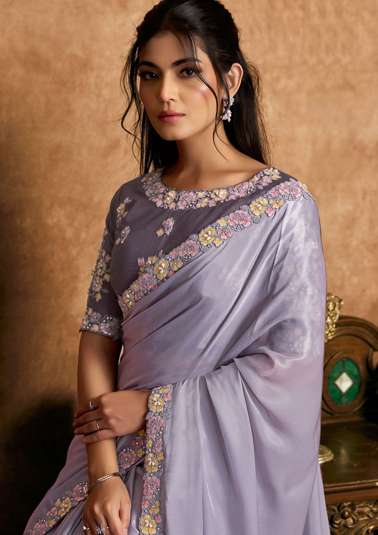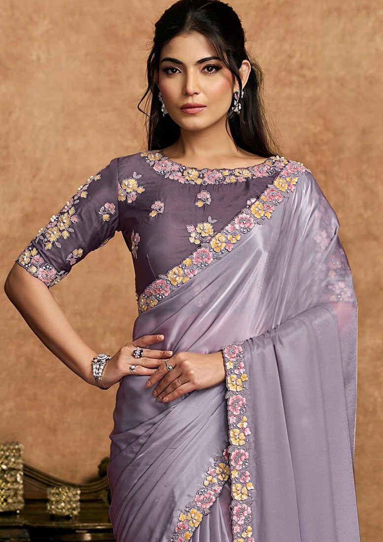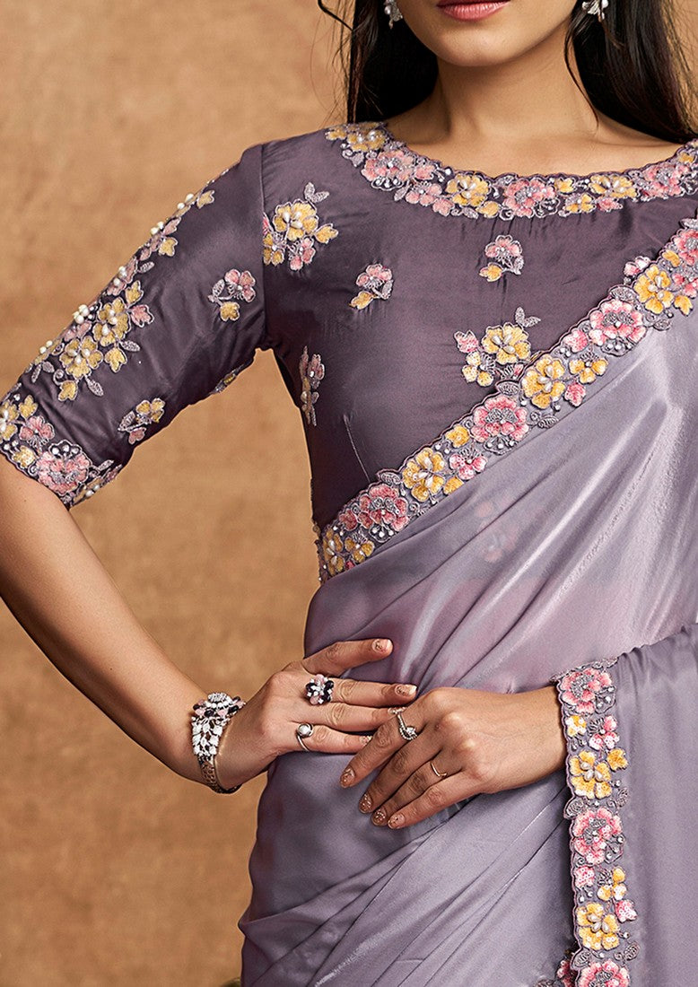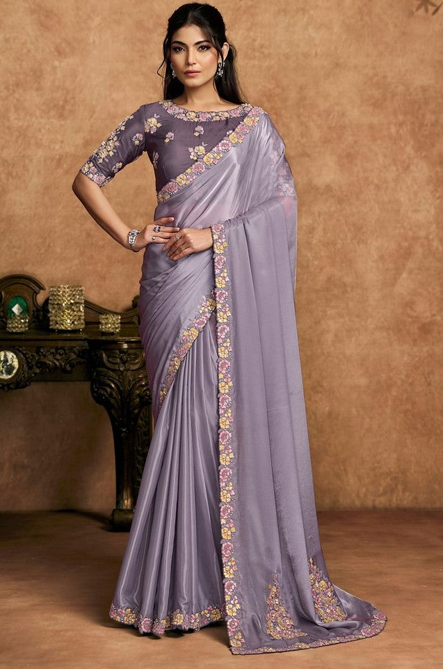 Lovely Purple Color Crepe Satin Fabric Designer Saree