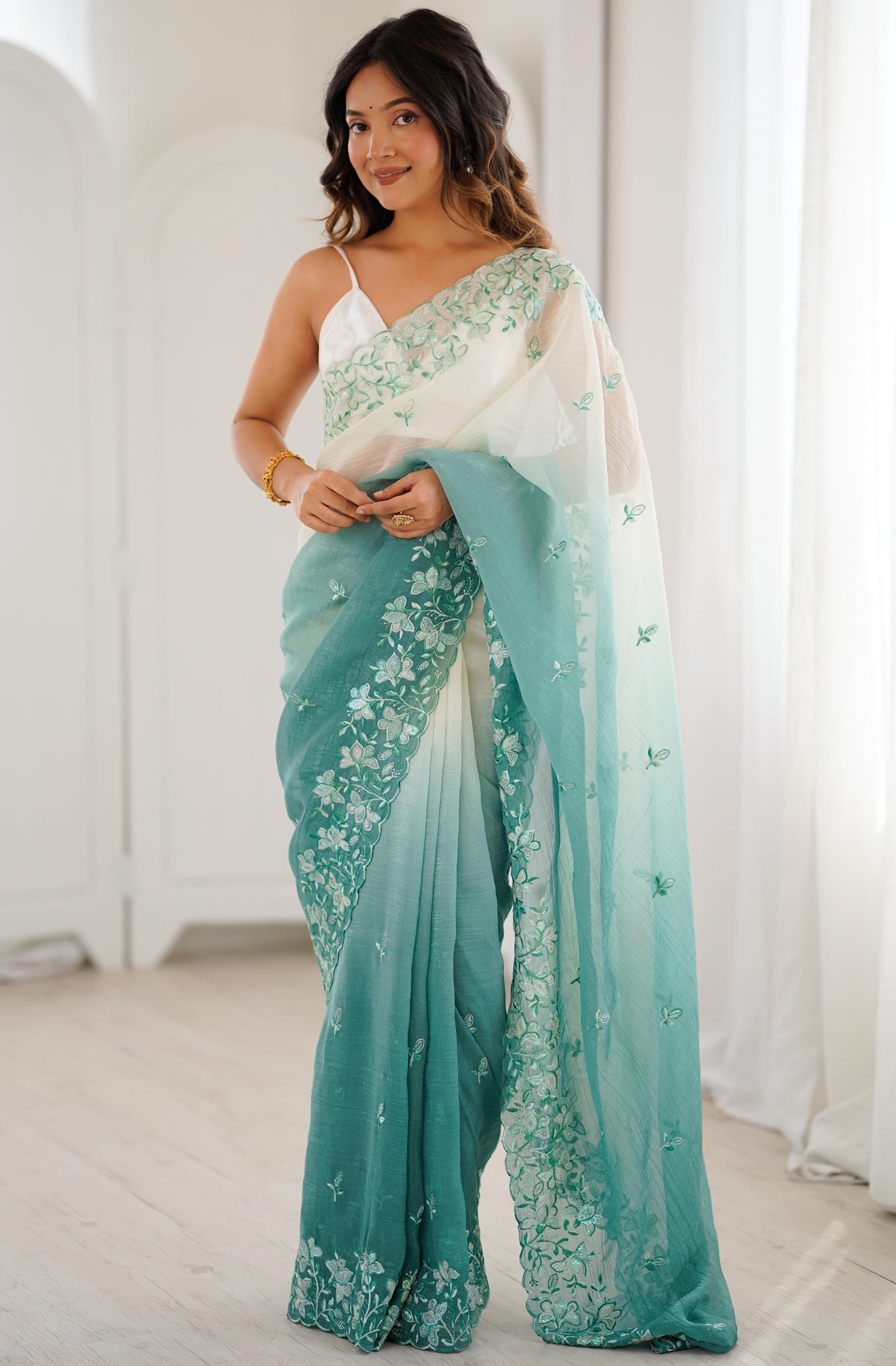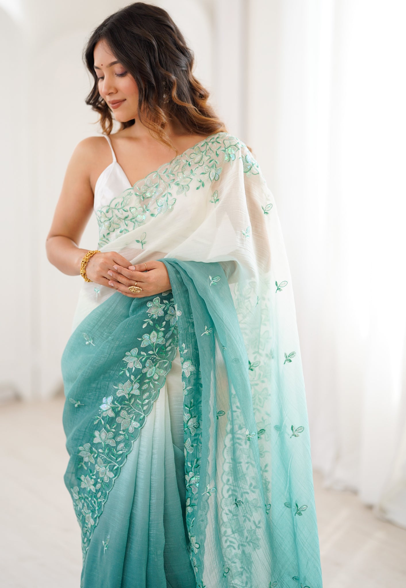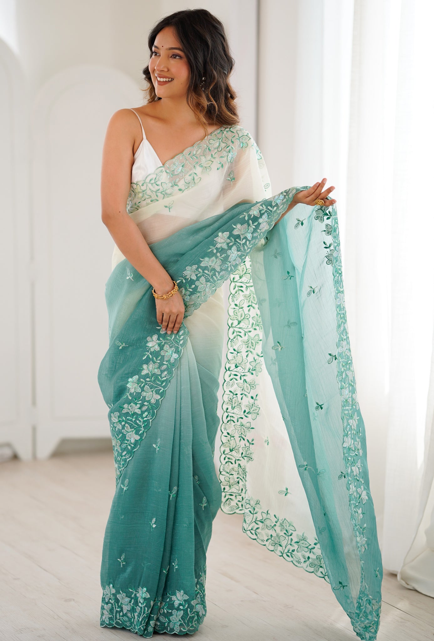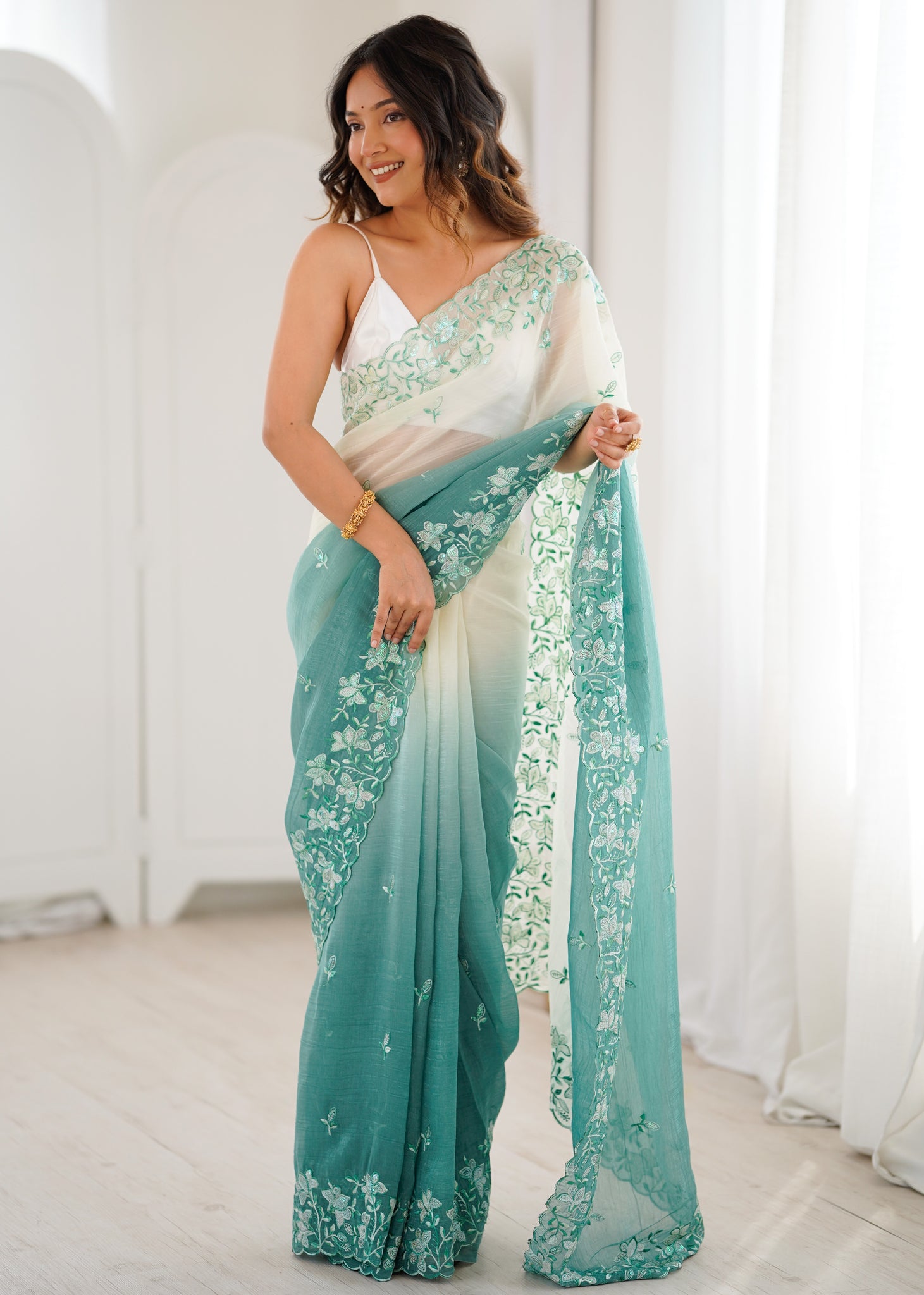 | Color | Saree Color - Turquoise, Blouse Color - White |