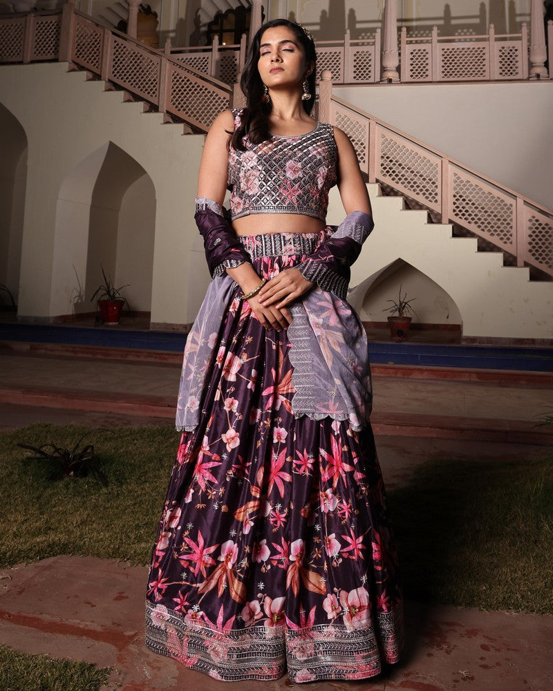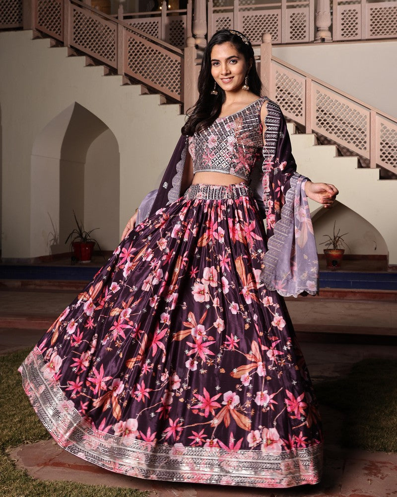Amazing Wine Color Chinon Fabric Party Wear Lehenga