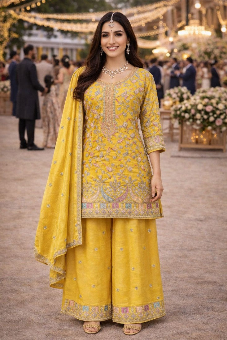 Amazing Yellow Color Chinon Fabric Plazzo Suit