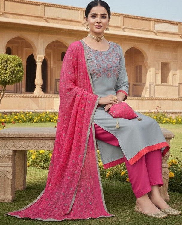 | Color | Top Color - Grey, Bottom Color - Pink, Dupatta Color - Pink |