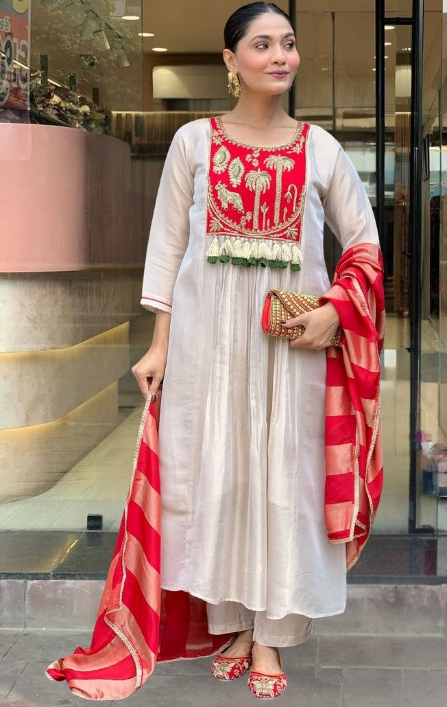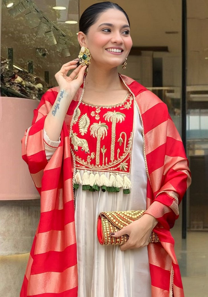 Tasteful Red Color Silk Fabric Designer Suit