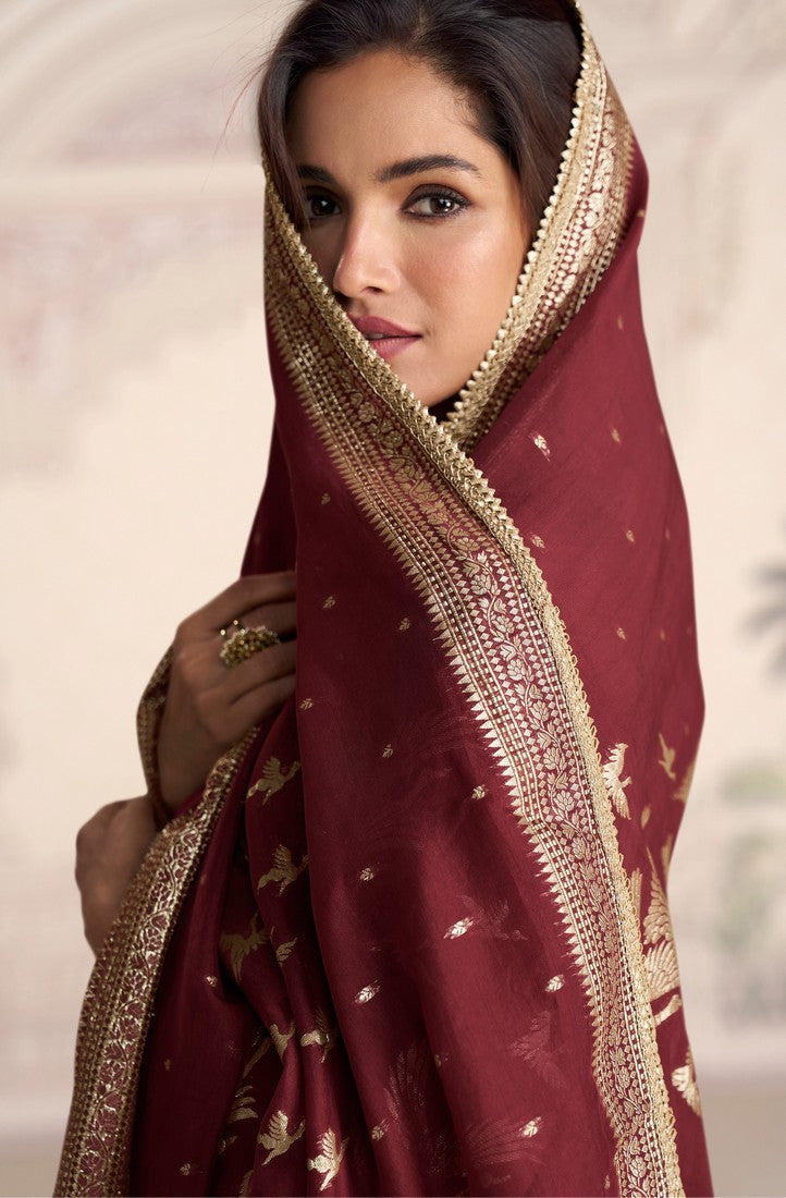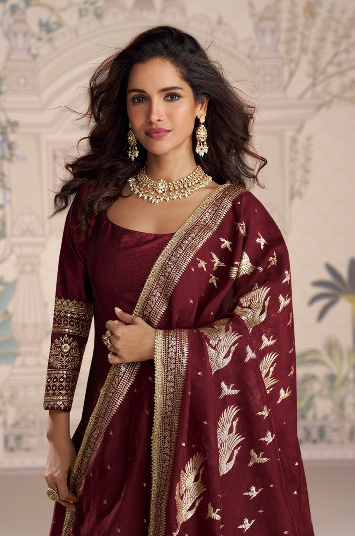Amazing Maroon Color Silk Fabric Partywear Suit