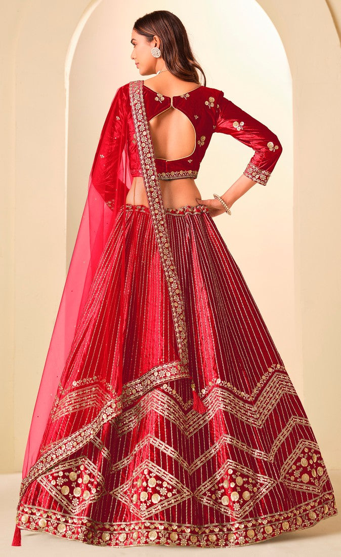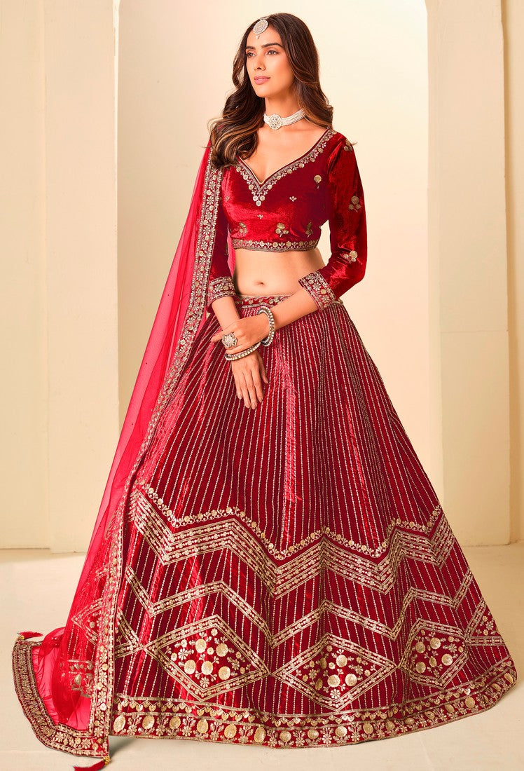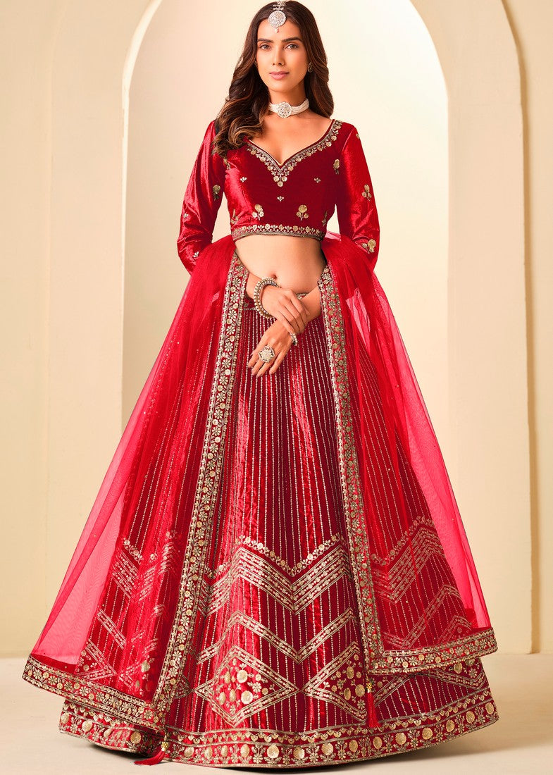 Amazing Red Color Velvet Fabric Partywear Lehenga