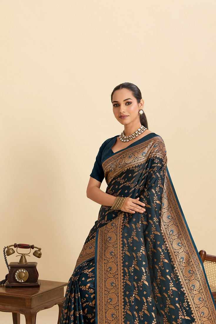 Dazzling Teal Color Satin Fabric Partywear Saree