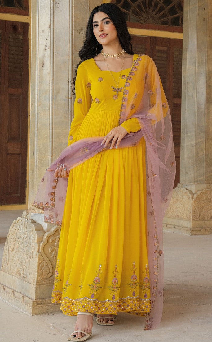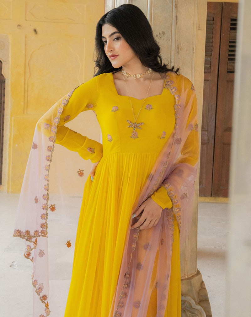 Attractive These Beautiful Party Wear Looking Readymade Gown With Bottom.These Gown And Dupatta Are Georgette Fabricated.Its Beautified With Disigner Embroidery Work.