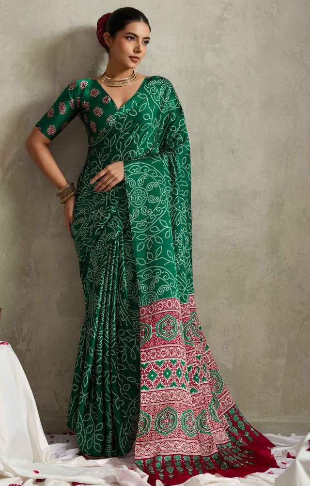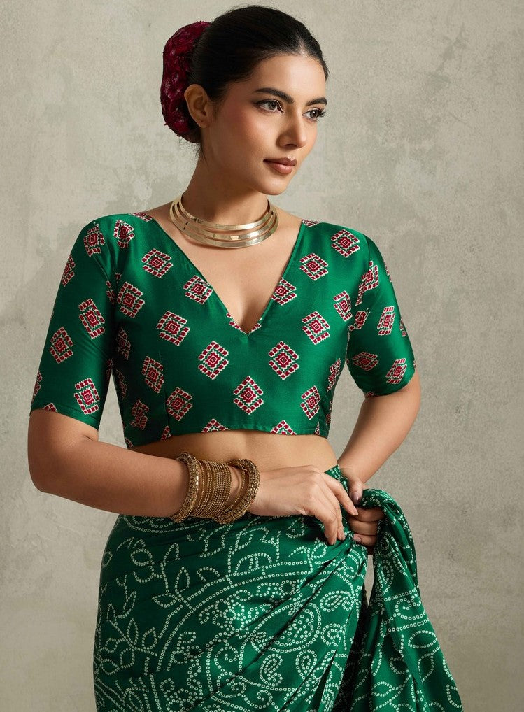 Looking These Traditional Party Wear Saree in Fine Colored.These Saree Are Satin Silk And Blouse is Fabricated On Satin Silk Pair.Its Beautified With Designer Bandhani Printed.