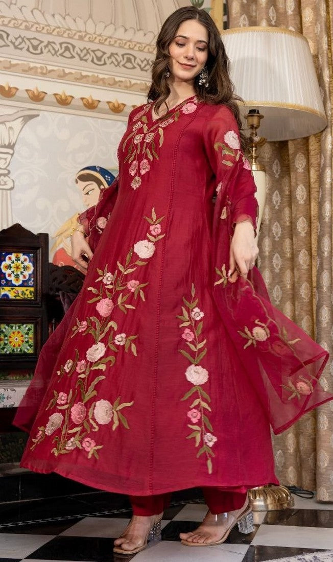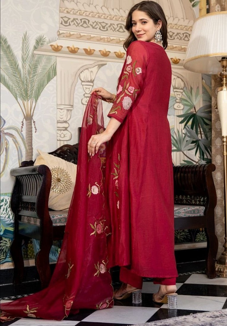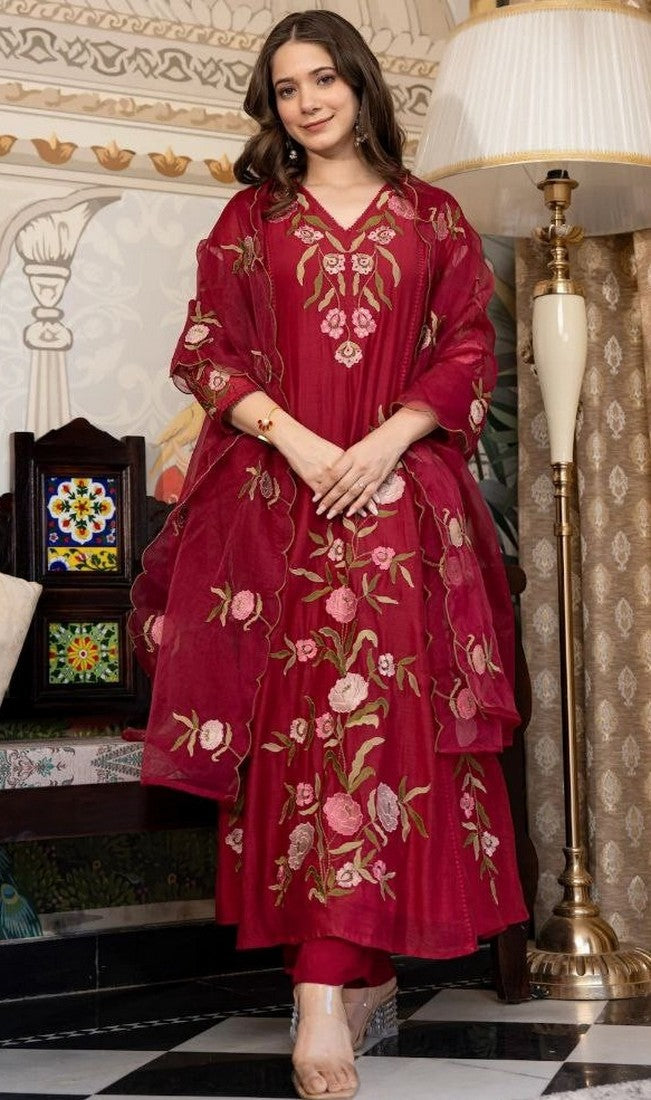 Lovely Red Color Silk Fabric Designer Suit