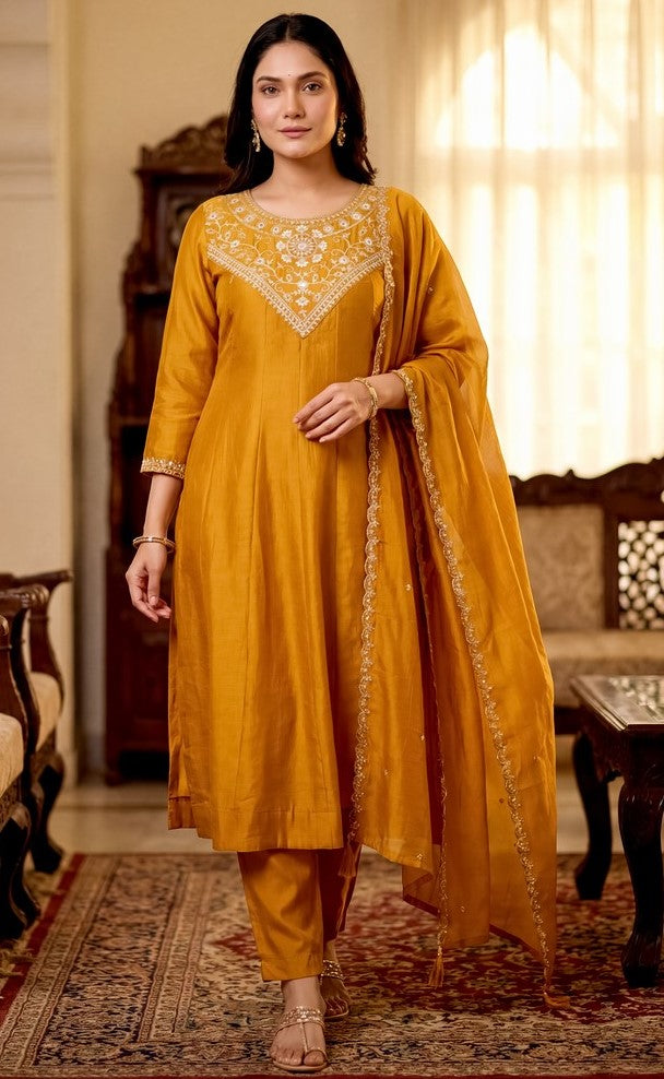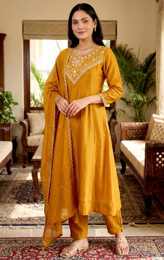 Tasteful Mustard Color Silk Fabric Designer Suit